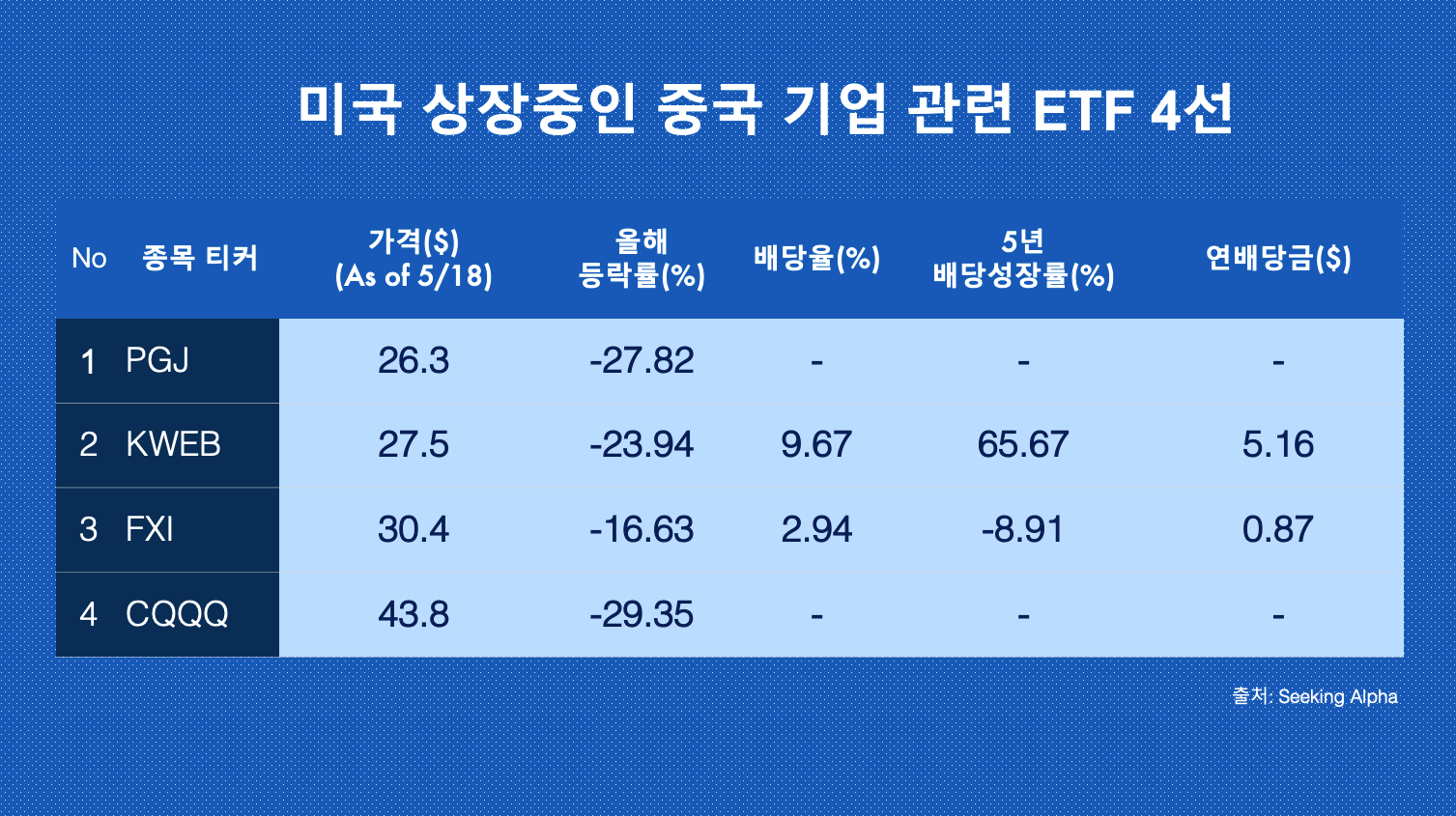 안녕하세요 일본에서 미국주식투자하는 도쿄드림입니다. 오늘은 미국 상장중인 중국 기업관련 ETF를 소개드리고자 합니다. 중국 기업 및 ETF 투자는 등락폭이 심하고 미중 관계 갈등으로 인해 안정정이라고 할수 없습니다. 하지만 세계2위의 경제력을 가진 중국인만큼 일정 부분의 중국 기업 관련 ETF는 검토해보아도 좋을듯 합니다.