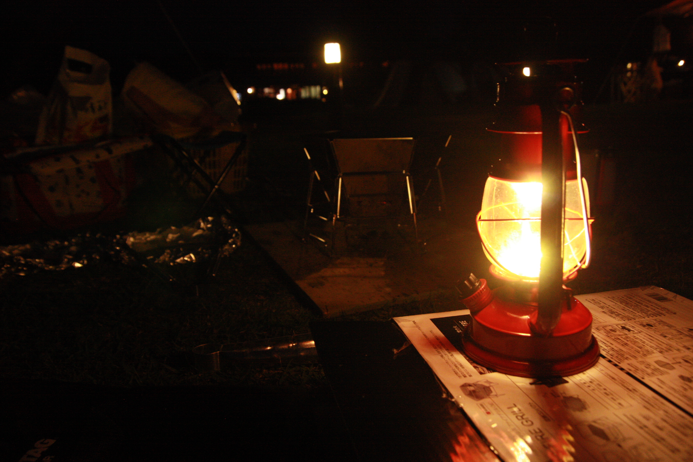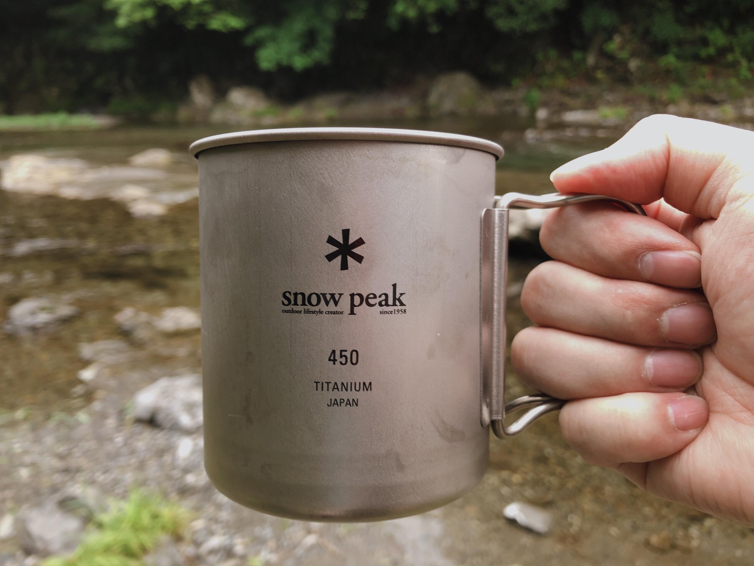 감성캠핑용품: 스노우피크의 티타늄 Titanium 450 컵과 Fieldoor사의 안티크 랜턴