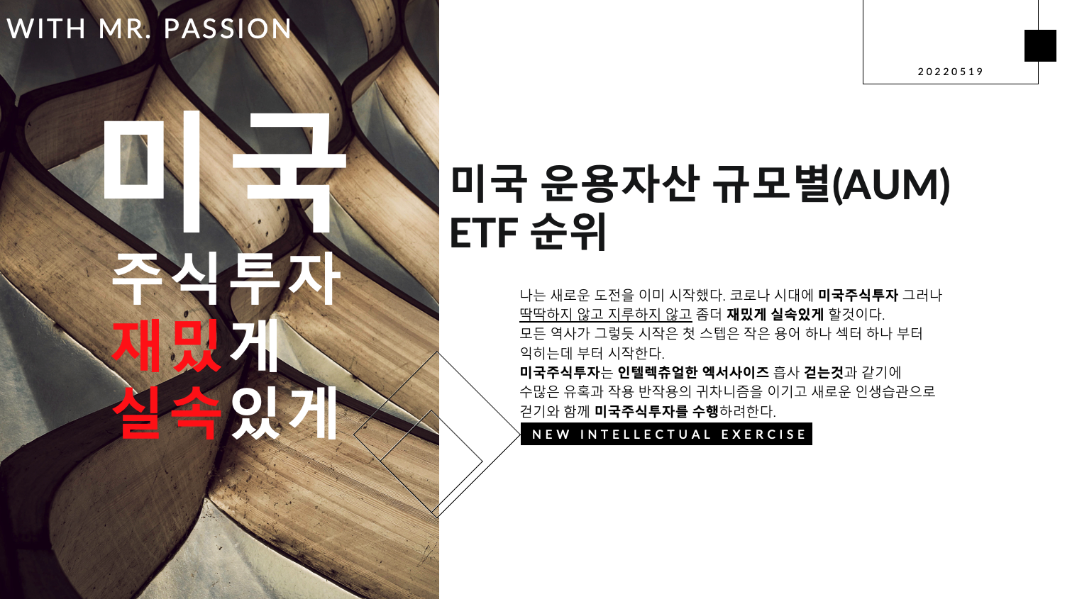 안녕하세요 일본에서 미국주식투자하는 도쿄드림입니다. 오늘은 미국에 상장중인 운용자산 규모별(AUM) ETF 순위를 올해 등락률,배당율,5년 배당성장률,연배당금과 함께 소개드리고자 합니다. 여러분의 최애 ETF는 무엇인지요? 미국 경제는 경기침체를 우려하여 급락한 하루였습니다. 아무쪼록 현금자산을 잘유지하면서 포트폴리오에 목적 목표로 하시는 종목들을 매수/매도하시기 바랍니다.
