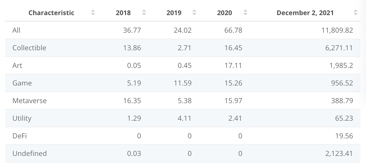 2021년이 NFT 시장이 큰 인지도를 높이는 계기를 마련함과 동시에 거래량도 폭발적으로 늘게된 한해였습니다. 거래량이 많은 카테고리로는 하기와 같았습니다. 전체 볼륨은 11 억 달러를 돌파했습니다.