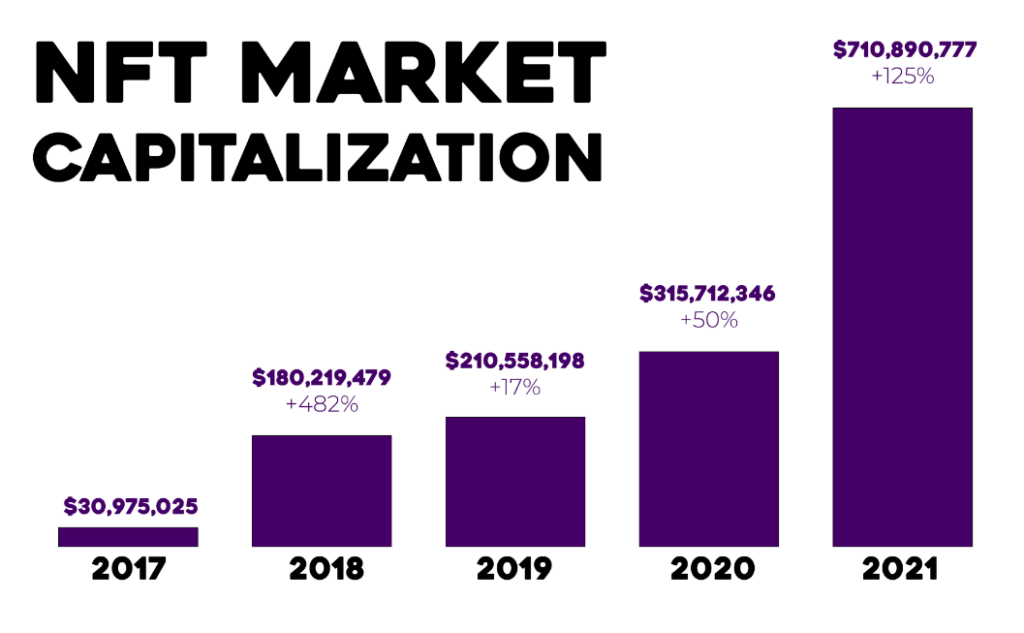 NFT Market Capitalization (시가총액)의 변화 추이 (2017년 - 2021년) 2019년 2억 1천만 달러 2021년 7억 1천만 달러 급성장하고 있는 자산시장임에 틀림없는 상황입니다.